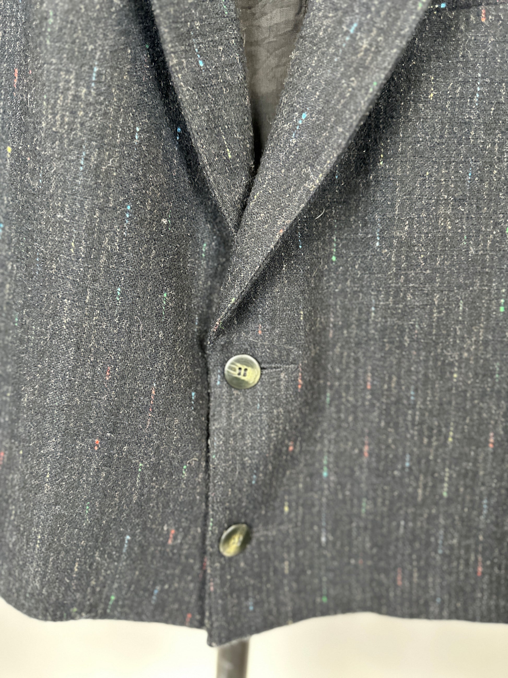 Wool blazer in a boxy/oversized, cropped fit. Dark background color shows off the colorful specks throughout, making this design even more unique! 2 button closure, fully lined. Excellent condition.