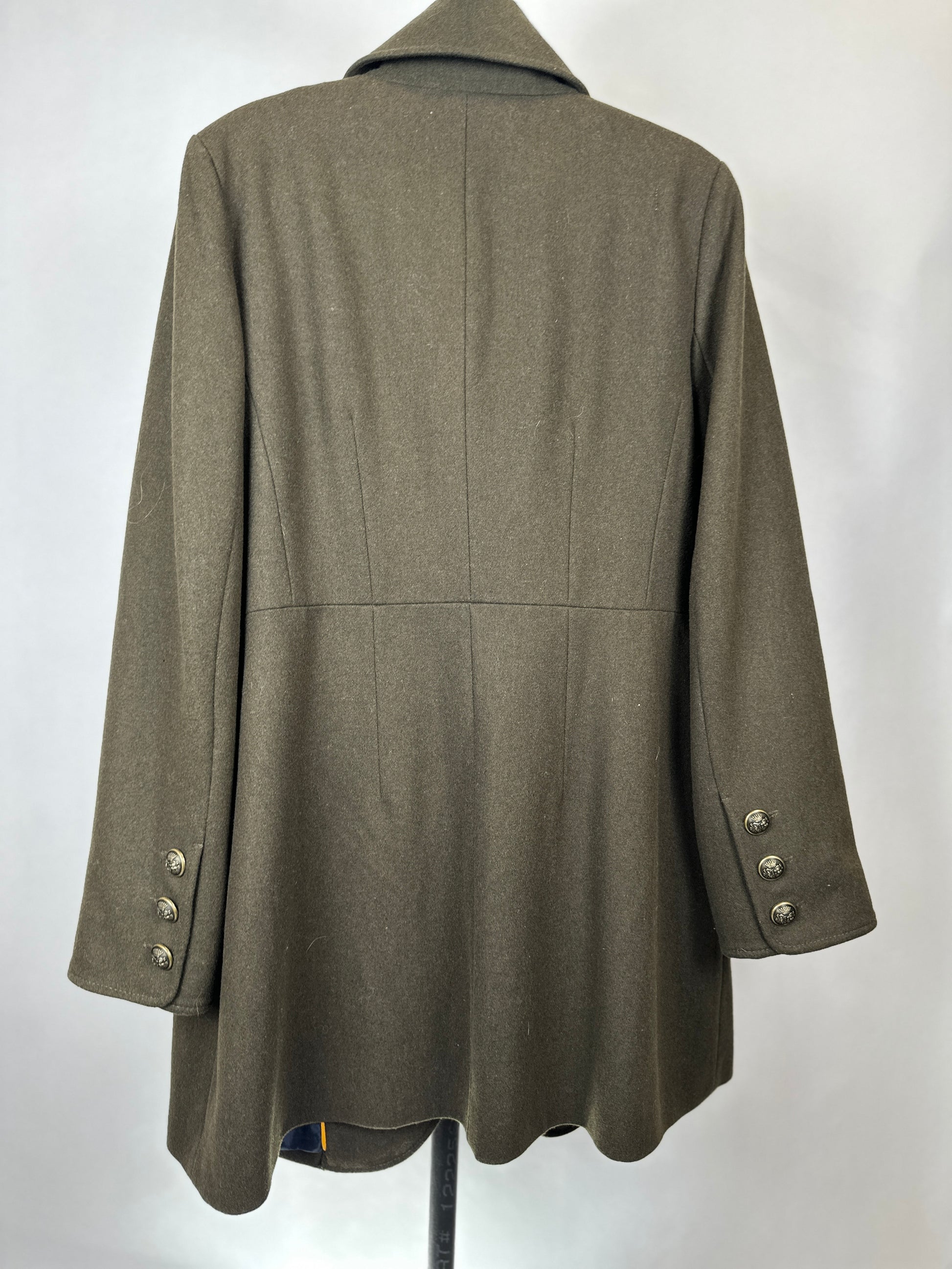Green wool military style coat with high collar and gorgeous brushed gold button detail. Curved hem in front with pockets, fully lined. Classic, edgy and unique all at the same time! Excellent condition.