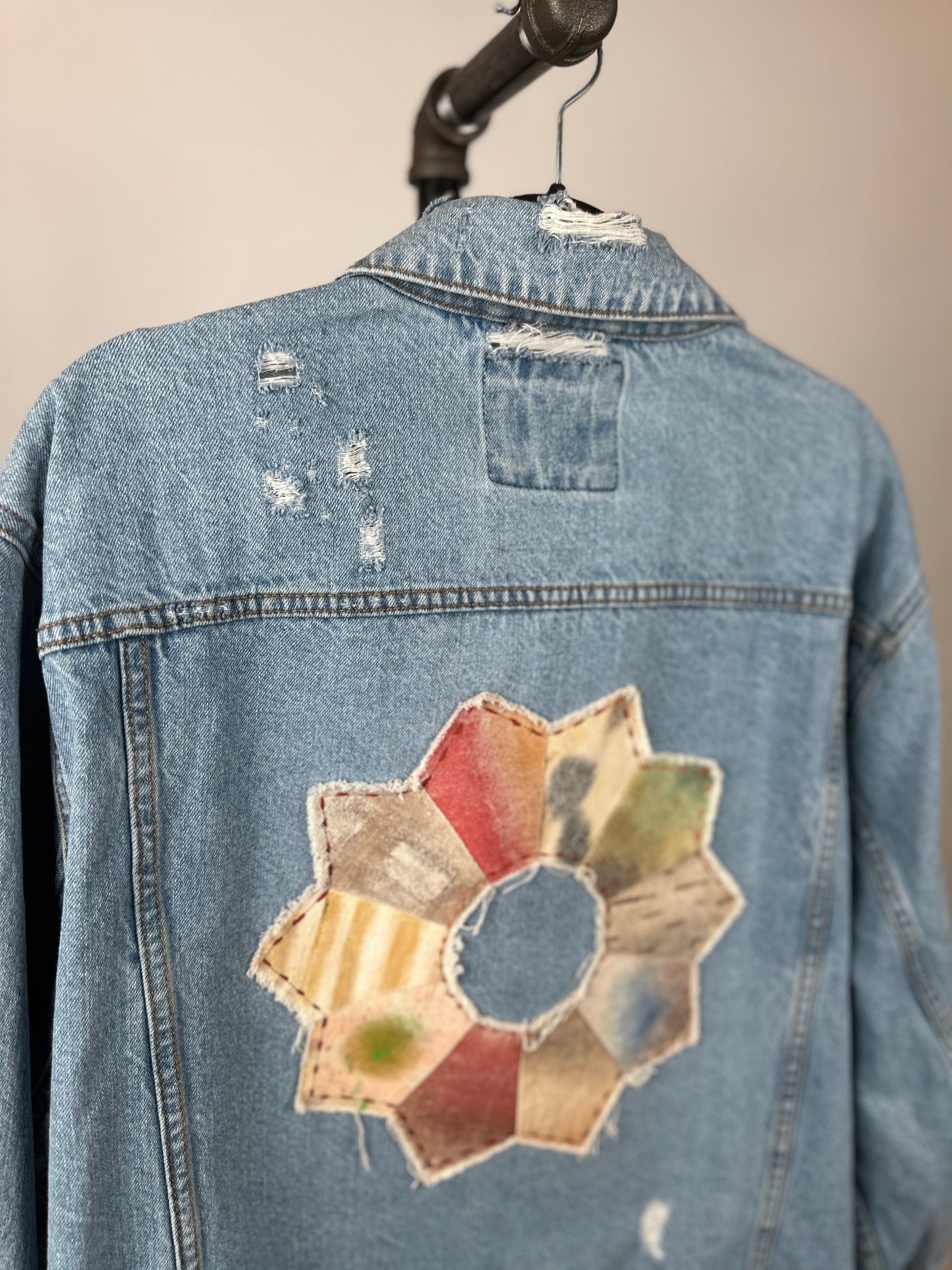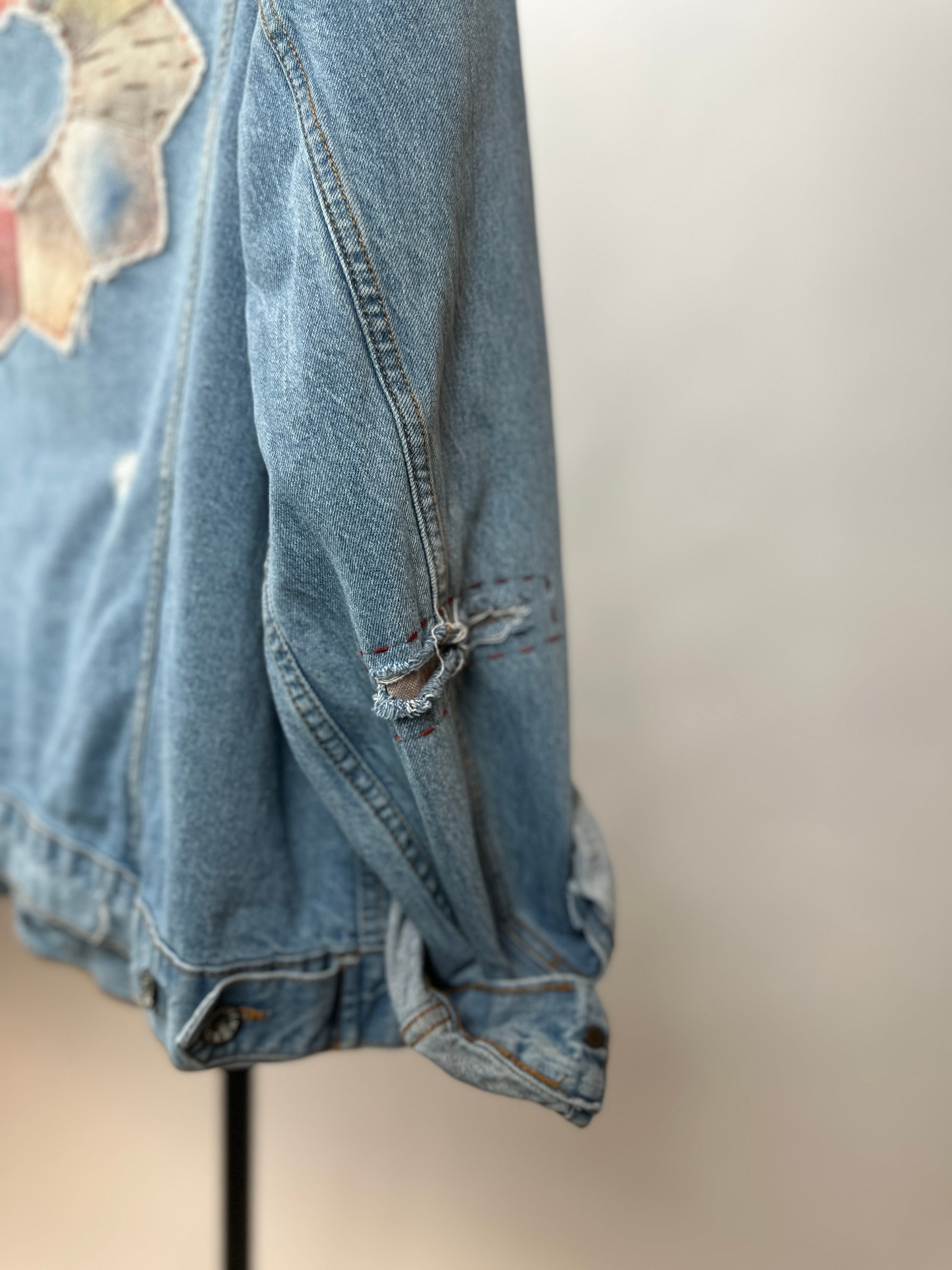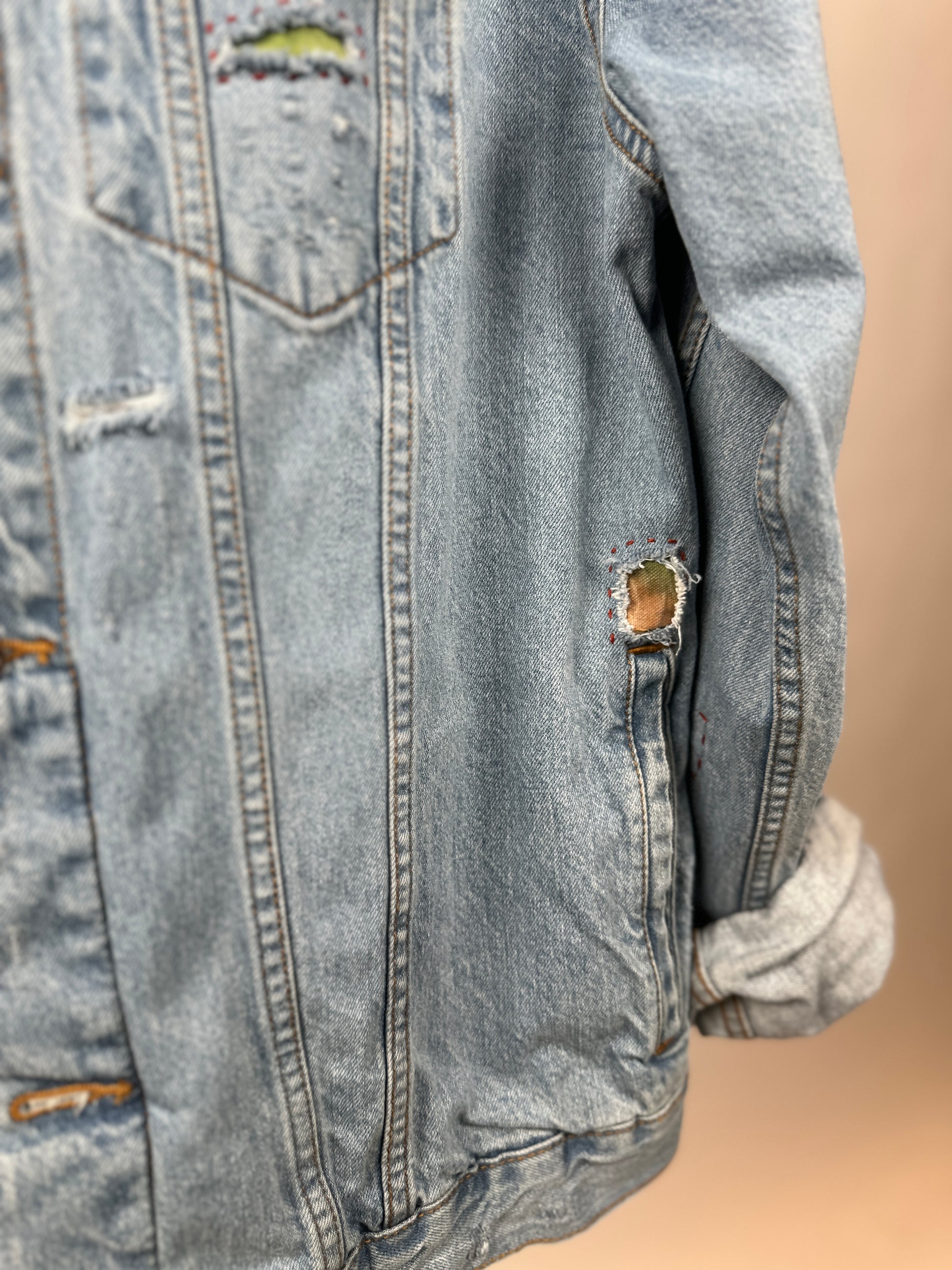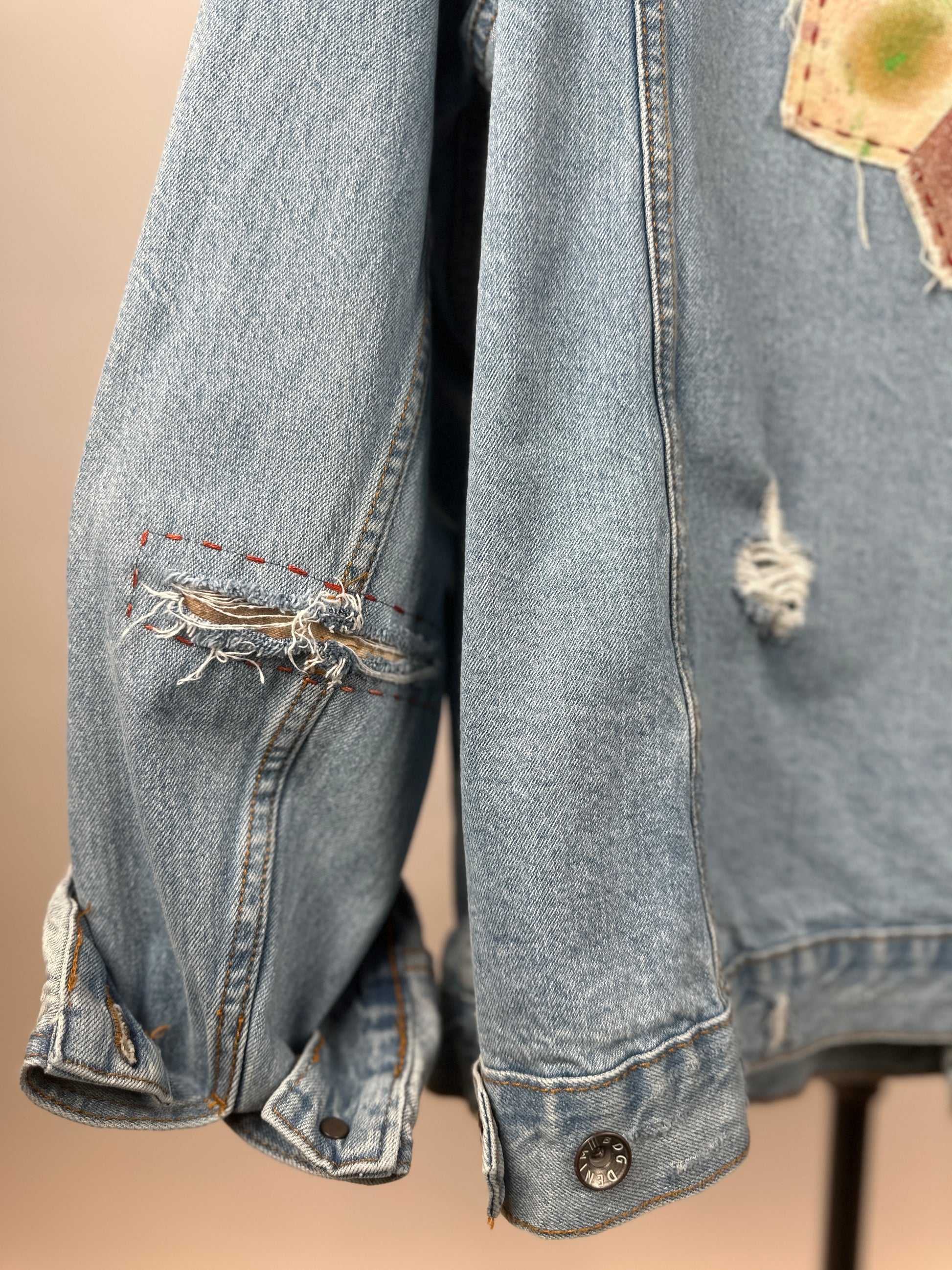Revamp your wardrobe with The Augusta! This upcycled denim jacket features a colorful hand painted patchwork design on the back and embroidery throughout. Distressed details and oversized fit add a touch of edginess to any outfit. Sustainable and stylish, this jacket is a must-have for any fashion lover.