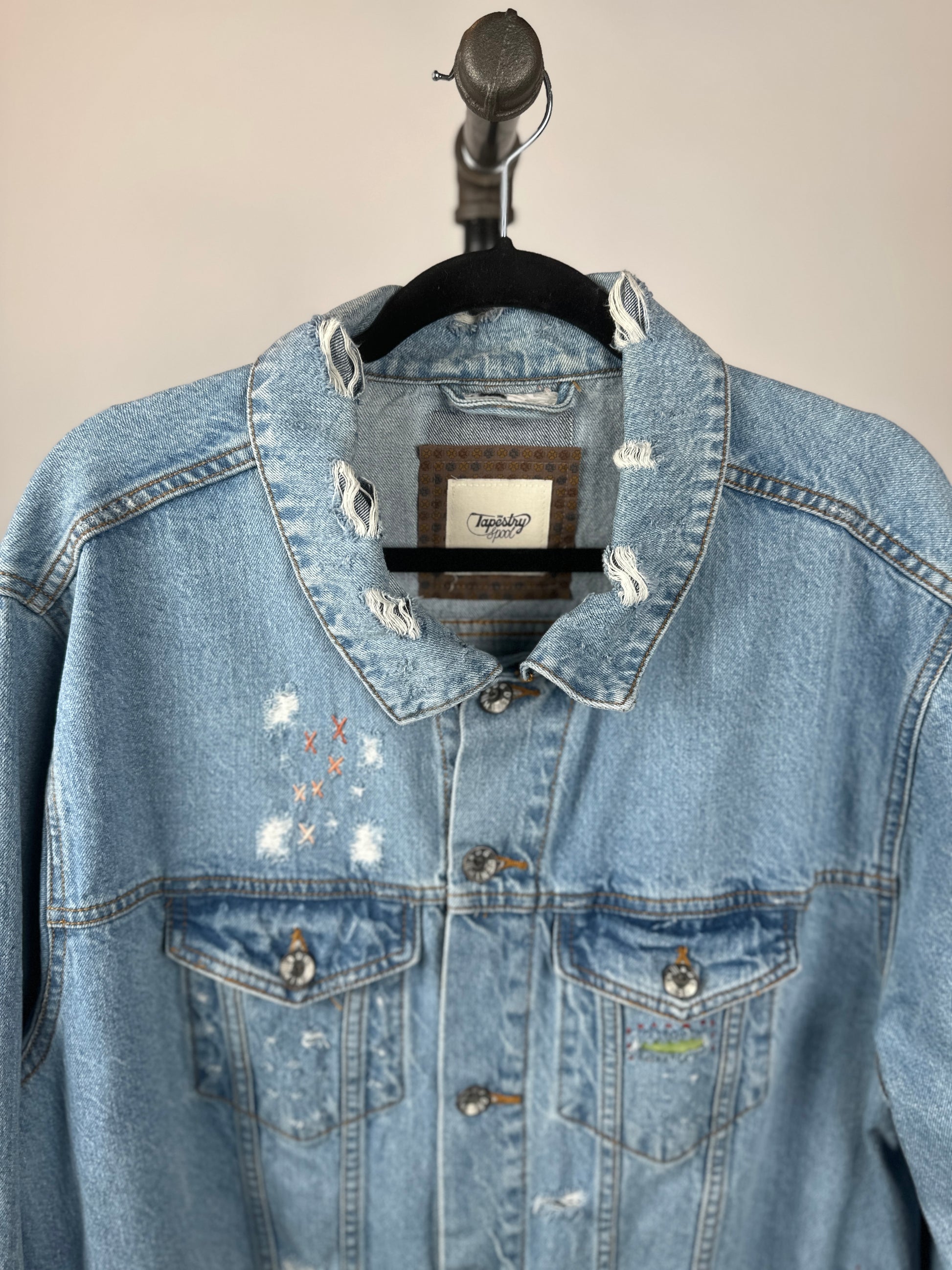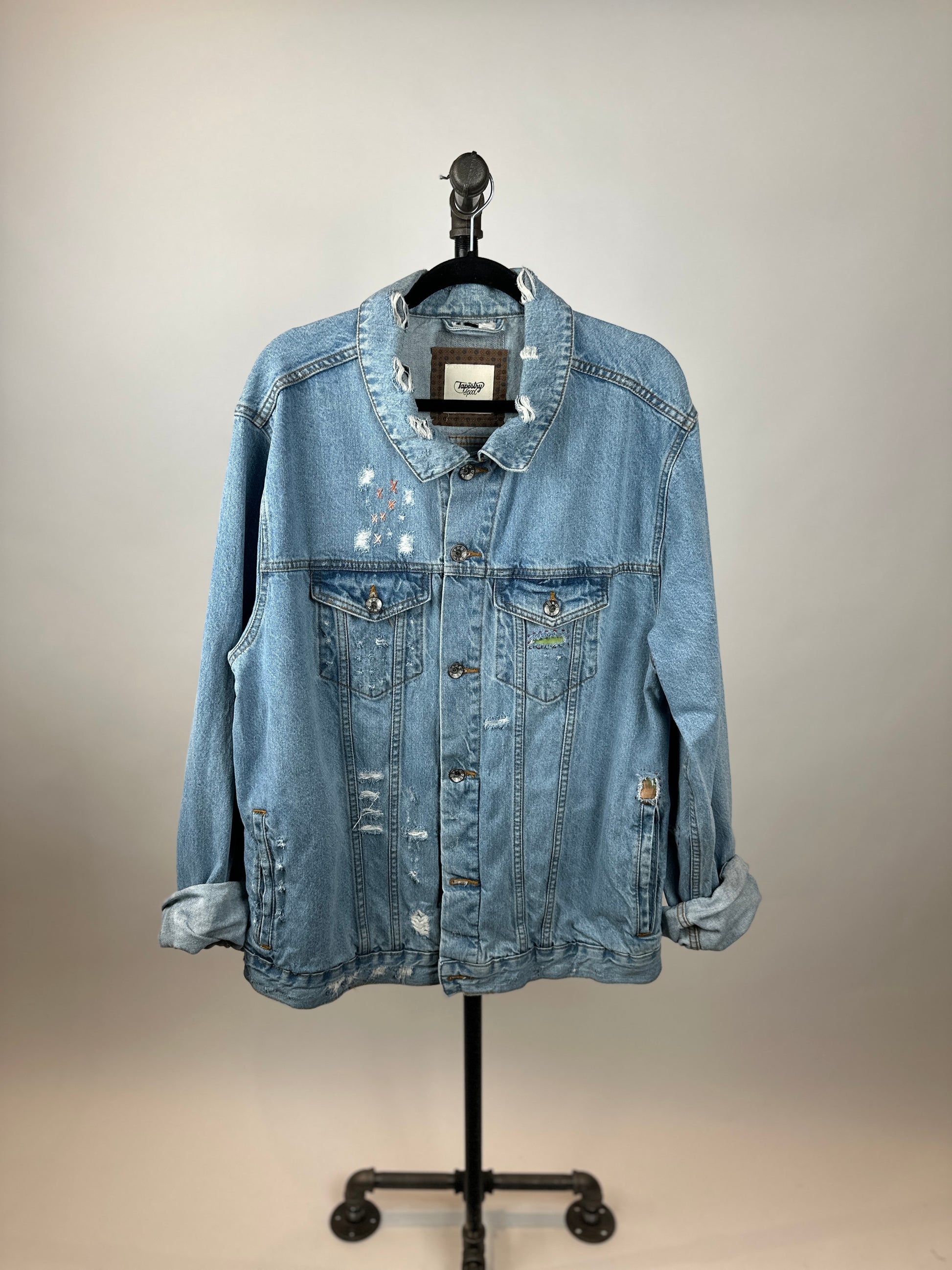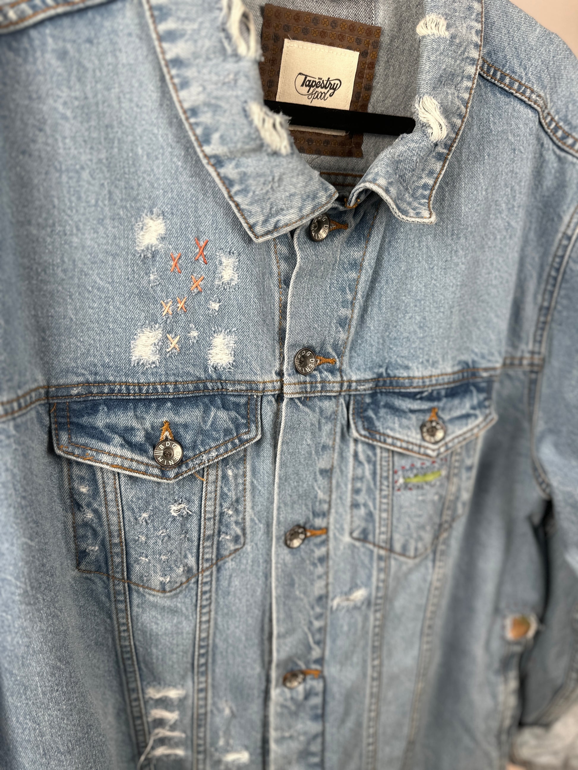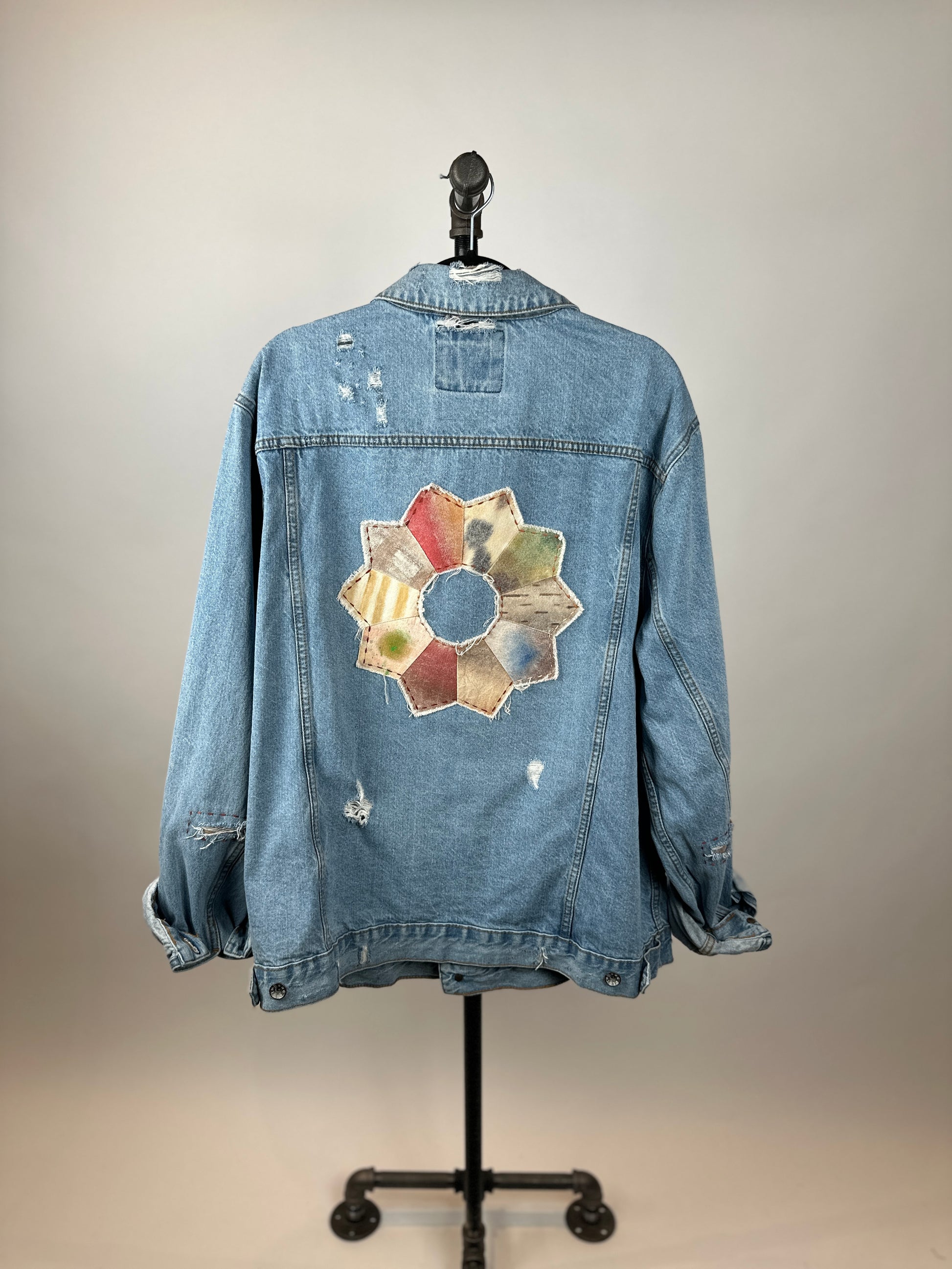 Revamp your wardrobe with The Augusta! This upcycled denim jacket features a colorful hand painted patchwork design on the back and embroidery throughout. Distressed details and oversized fit add a touch of edginess to any outfit. Sustainable and stylish, this jacket is a must-have for any fashion lover.