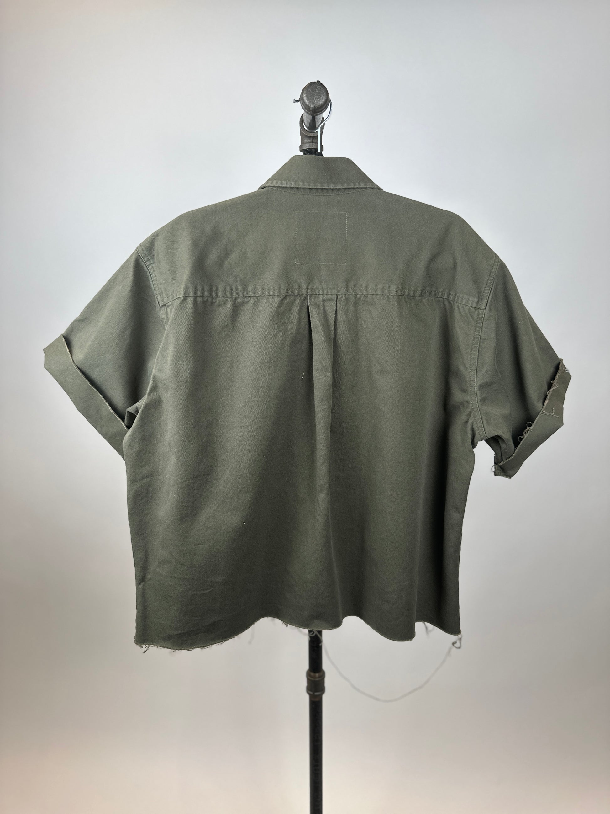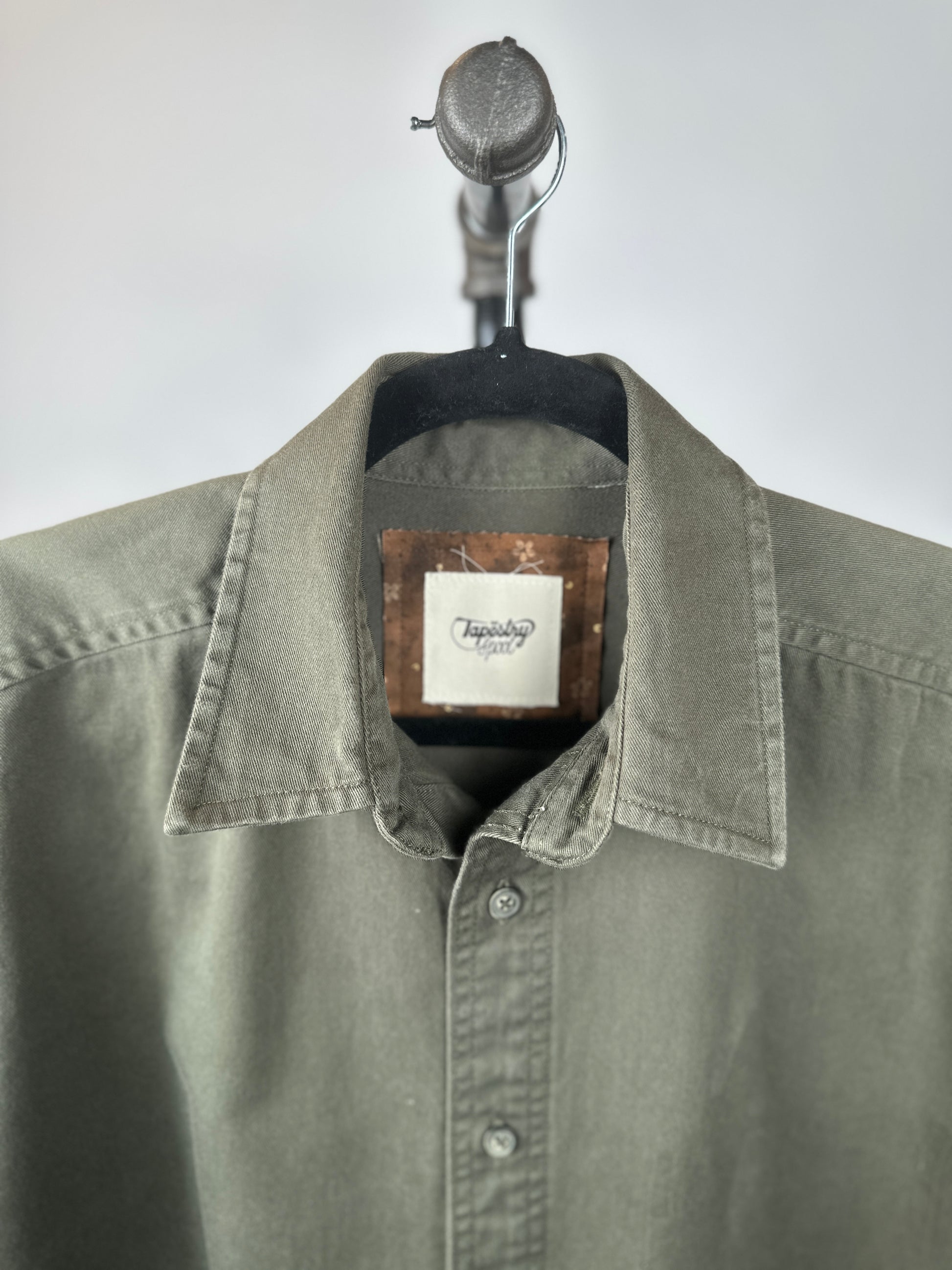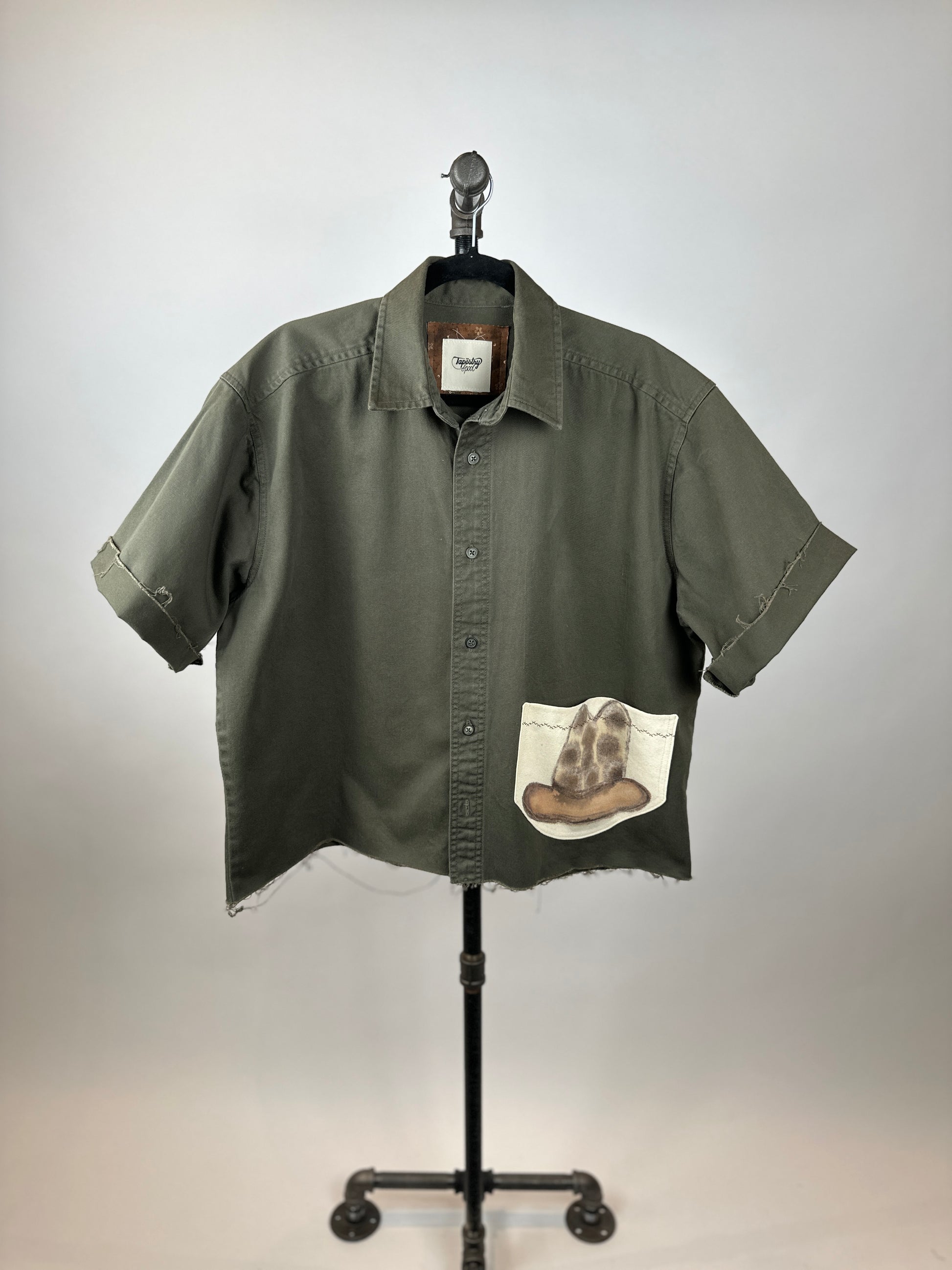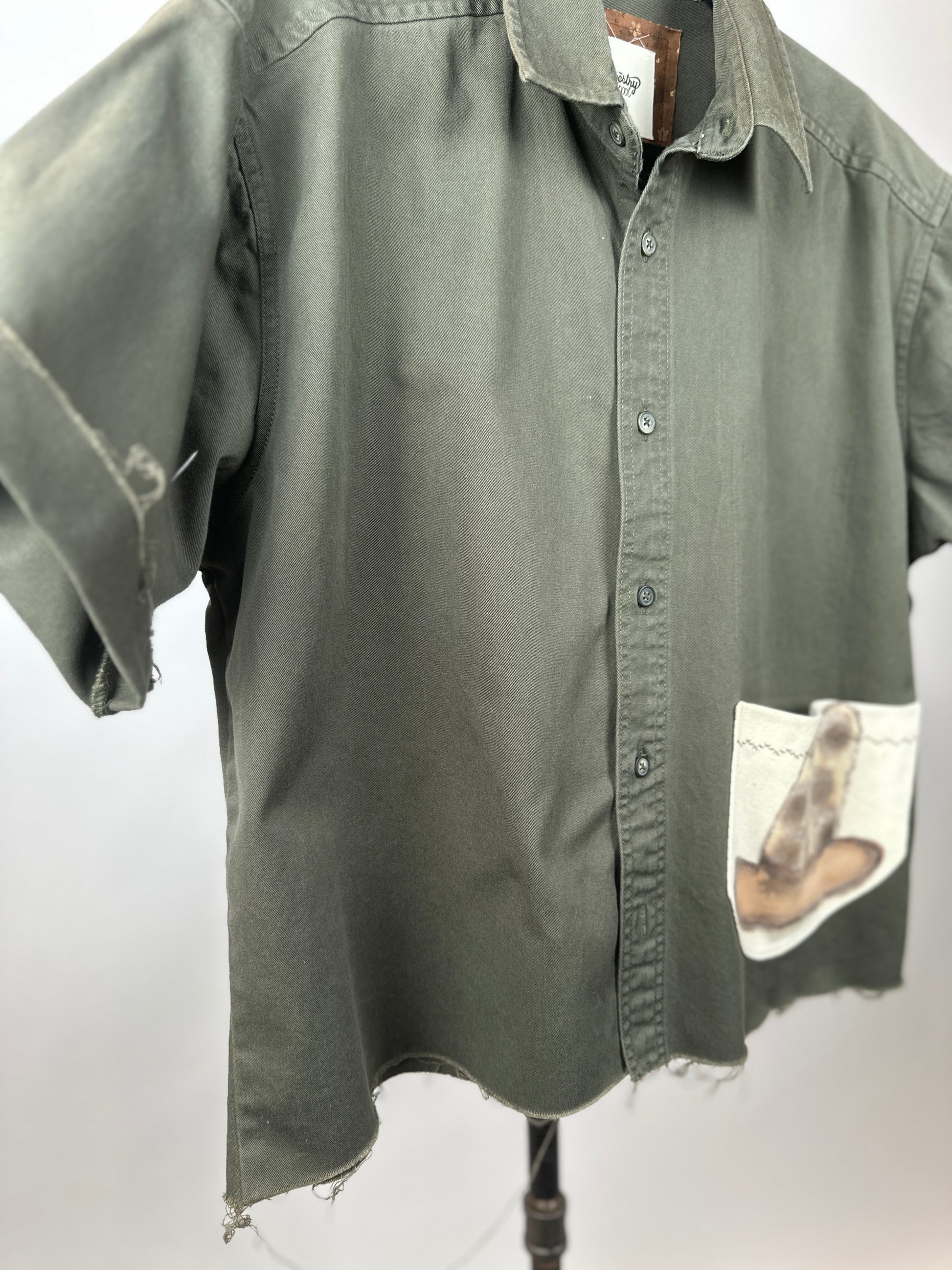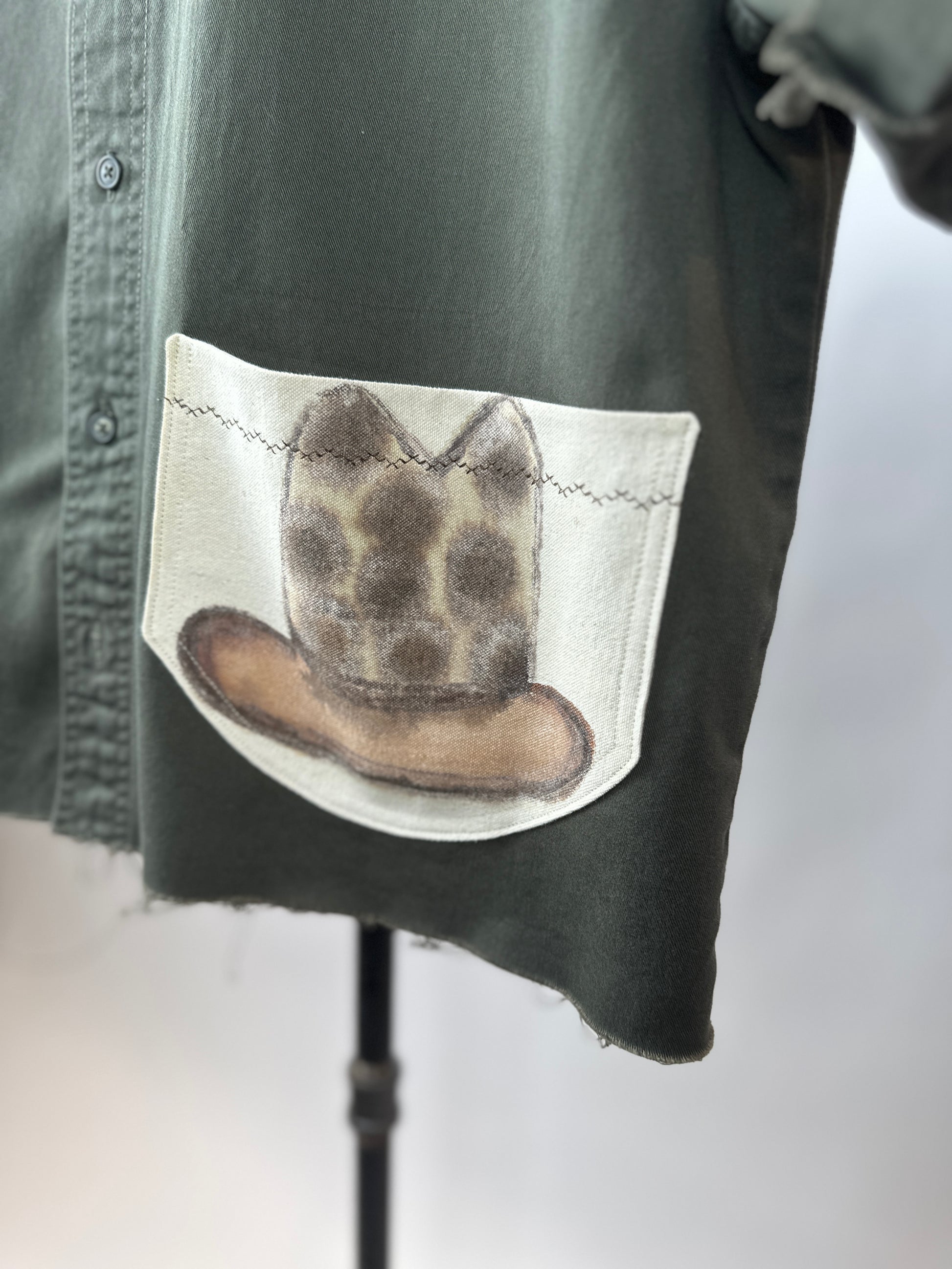 The Ramona, a quirky and playful addition to any wardrobe, is a comfy upcycled woven shirt complete with a unique hand painted pocket featuring a cowboy hat. Fabric is a heavyweight cotton offering a nice structured but relaxed fit. Raw edges at hemline and sleeves.